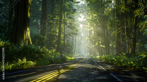 © S, Obraz premium Serene Sunlit Forest Paths: Morning Light Filtering Through Lush Canopies