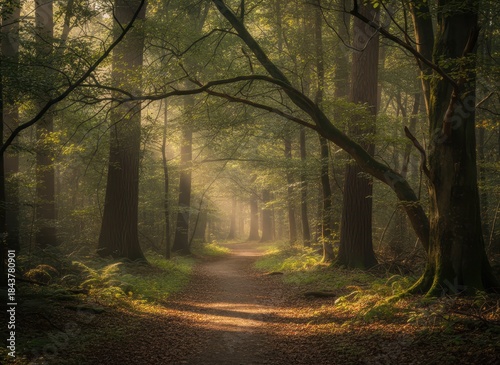 © Kitta Studio, Obraz premium Serene Sunlit Forest Pathway Surrounded by Lush Greenery