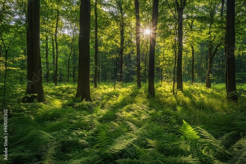 Naklejka premium Serene Sunlit Forest with Lush Green Undergrowth - Peaceful Woodland Landscape , ai