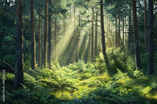 Fototapeta premium Serene Sunlit Forest with Lush Green Undergrowth - Peaceful Woodland Landscape , ai