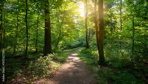Fototapeta premium serene sunlit path through a lush green forest of trees creating a tranquil...