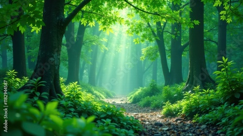 © parichart, Obraz premium Serene sunlit path through a mystical forest with lush green foliage and a pebbled trail