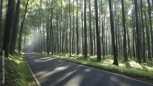 © NadenDesign, Obraz premium Serene Sunlit Path Through Lush Green Forest with Gentle Fog and Tall Trees