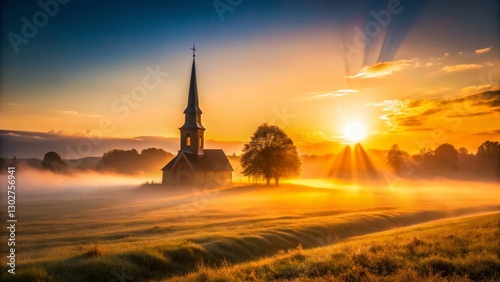 © Sirinporn, Obraz premium Serene Sunrise: Church Steeple Bathed in Golden Light - Stock Photo