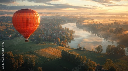 © intan ptra, Obraz premium Serene Sunrise Hot Air Balloon Ride Over Misty River Valley