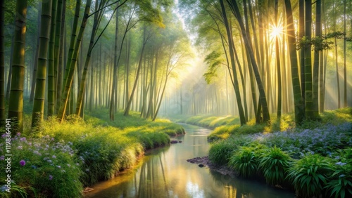 © PloyJai, Fototapeta premium Serene Sunrise in a Bamboo Forest with a Gently Flowing Stream