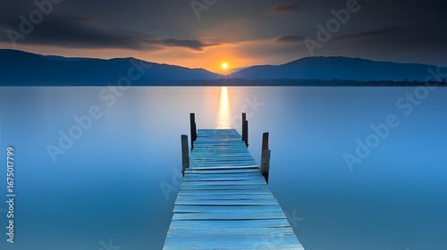 © Abul, Obraz premium Serene Sunrise Lake Wooden Dock Peaceful Landscape