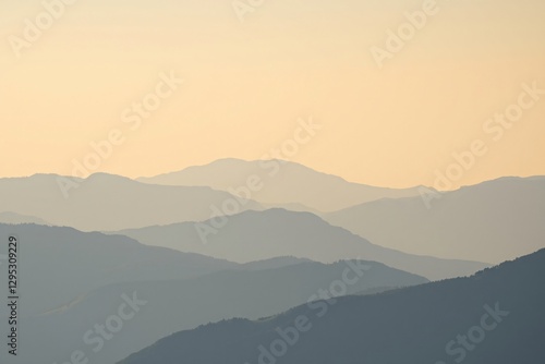 © hyperbleh, Obraz premium serene sunrise landscape with layers of misty mountains