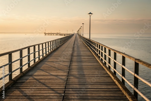 Obraz premium Serene Sunrise Long Wooden Pier Extending into Calm Ocean Waters