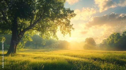 © Mulyadi Lim, Obraz premium Serene Sunrise Meadow: Golden Light Illuminates Tranquil Landscape