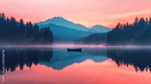© Satisgitfied, Fototapeta premium Serene Sunrise Misty Lake Mountains and Solitary Canoe