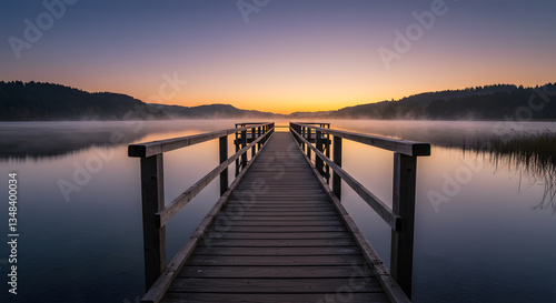 Naklejka premium Serene Sunrise: Misty Lake Pier at Dawn