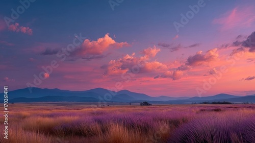© nan, Fototapeta premium Serene sunrise or sunset over a vast plain with purple hued grasses, distant blue mountains,