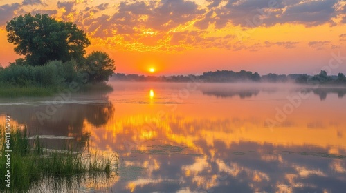 © Abdul, Fototapeta premium Serene sunrise over a misty lake
