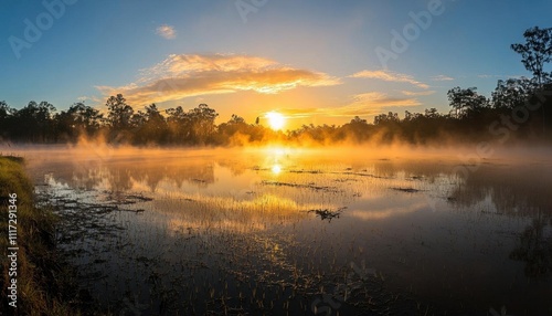 Obraz premium Serene sunrise over a misty lake, reflecting vibrant colors.