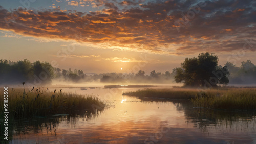 Fototapeta premium Serene sunrise over a misty lake surrounded by lush greenery, reflecting the...