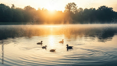 © Sampao, Naklejka premium Serene Sunrise Over a Misty Lake with Ducks Swimming Peacefully
