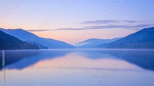 Fototapeta premium Serene sunrise over a still lake with mist and mountains reflected in the water.