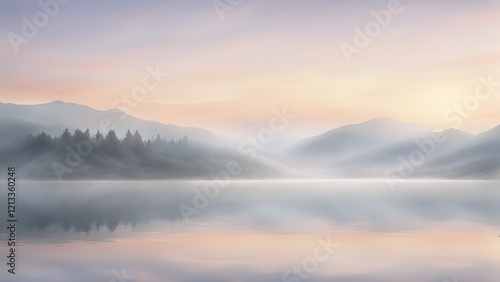 Fototapeta premium Serene sunrise over a tranquil lake reflecting misty mountains and a forest.