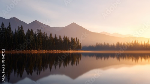 Obraz premium Serene sunrise over a tranquil lake surrounded by mountains and forests,...