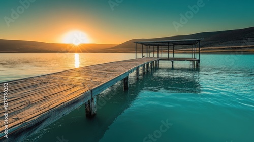 © Tyrah, Fototapeta premium Serene sunrise over a tranquil lake with a wooden dock extending into the water