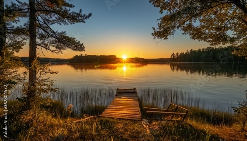 © Bernardo, Fototapeta premium Serene Sunrise Over a Tranquil Lake with a Wooden Pier