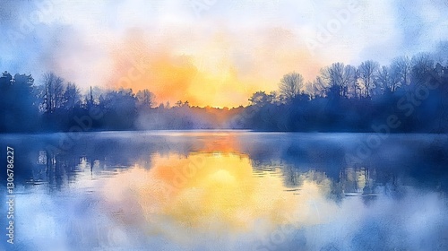 Fototapeta premium Serene Sunrise Over a Tranquil Lake with Abstract Reflections, Watercolor on...