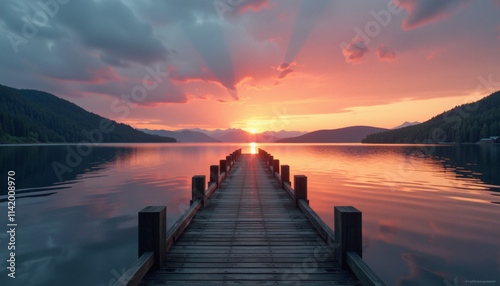 © Leah, Fototapeta premium Serene Sunrise Over a Wooden Pier on a Calm Lake