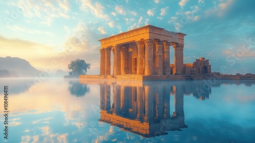 Obraz premium Serene sunrise over ancient temple reflected in still water.
