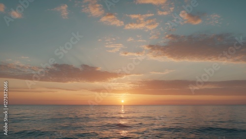 © The 2R Artificiality, Naklejka premium Serene Sunrise Over Calm Ocean Waters With Expansive Sky Perfect For Text Overlay