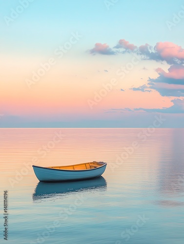 © SUKHUM, Naklejka premium Serene sunrise over calm water, single rowboat gently floats, peaceful pastel sky, tranquil scene.