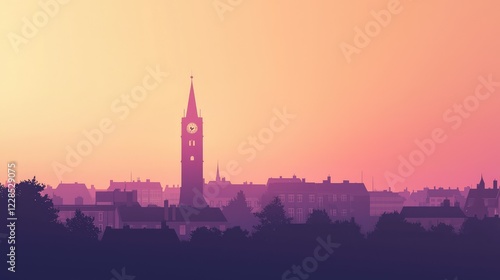 © Kitta Studio, Fototapeta premium Serene Sunrise Over Cityscape With Clock Tower Silhouette