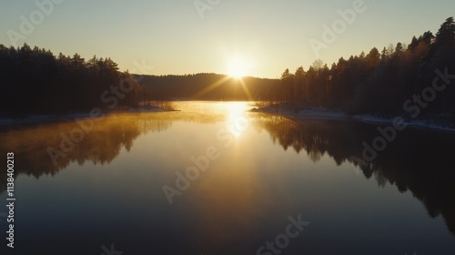 Fototapeta premium Serene sunrise over Finland forest lake, frosty shores, clear reflections, and mist rising in golden morning light.