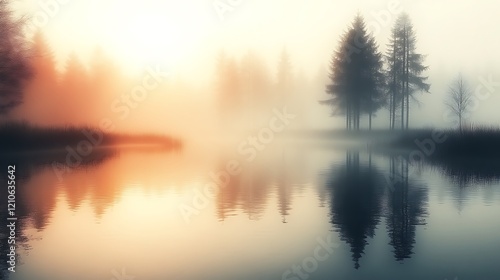 Fototapeta premium Serene Sunrise Over Foggy Lake And Trees