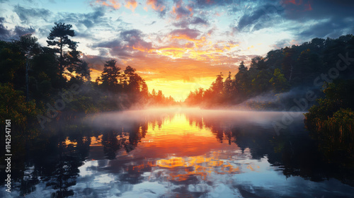 © Nakorn, Obraz premium Serene sunrise over foggy river nature landscape scene reflective water tranquil environment artistic viewpoint