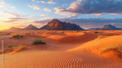 © Damen, Naklejka premium Serene Sunrise Over Golden Sand Dunes with Majestic Mountains in the Background Landscape