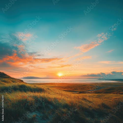 © Nucharee, Fototapeta premium Serene sunrise over grassy plains.