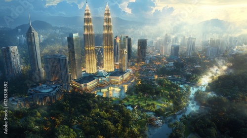 Obraz premium Serene sunrise over Kuala Lumpur iconic towers peaceful reflection