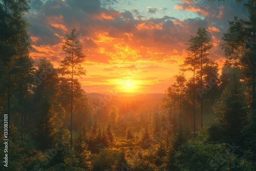 Naklejka premium Serene Sunrise Over Lush Forest: A breathtaking view of golden sunlight...