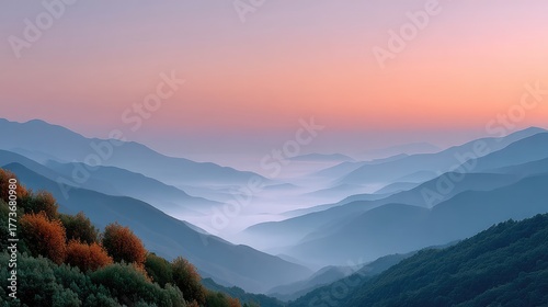 © ardi, Obraz premium Serene Sunrise Over Misty Forested Hills with Golden Hues in the Sky and Gentle Blue Fog in the Valleys