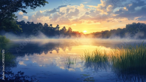 © muhammad, Fototapeta premium Serene Sunrise Over Misty Lake And Forest