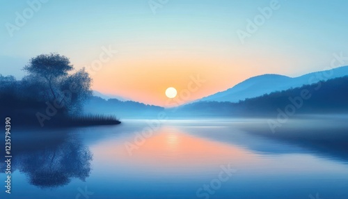 © Lumevia, Fototapeta premium Serene Sunrise Over Misty Lake and Mountains