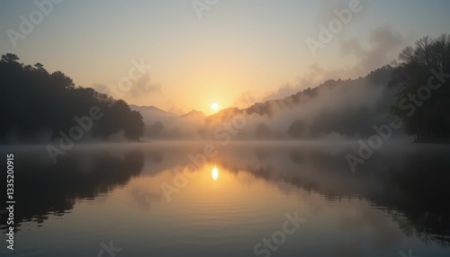 © Kitta Studio, Obraz premium Serene Sunrise Over Misty Lake with Mountains and Reflective Water