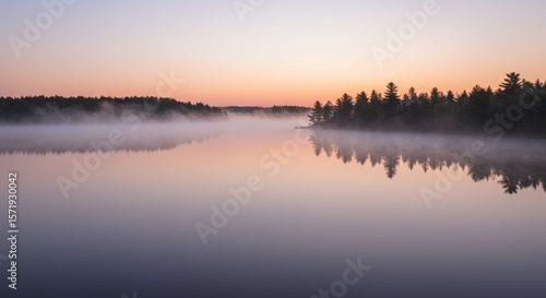 © Boonyawadee.K, Fototapeta premium Serene Sunrise over Misty Lake with Reflections