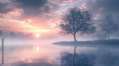 Fototapeta premium Serene Sunrise Over Misty Lake with Trees