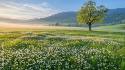 Obraz premium Serene sunrise over misty meadow with wildflowers and lone tree.