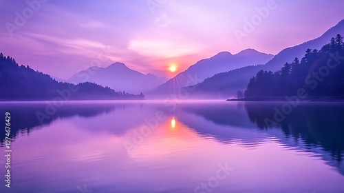 Fototapeta premium Serene Sunrise Over Misty Mountain Lake