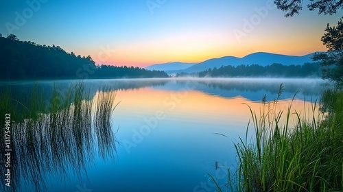 Fototapeta premium Serene Sunrise over Misty Mountain Lake: A Breathtaking Reflection of...