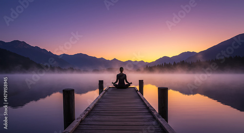 Naklejka premium Serene sunrise over misty mountain lake with a person meditating at dawn