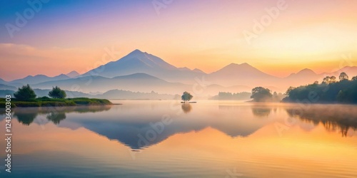 Naklejka premium Serene Sunrise Over Misty Mountain Lake with Island Tree Reflection